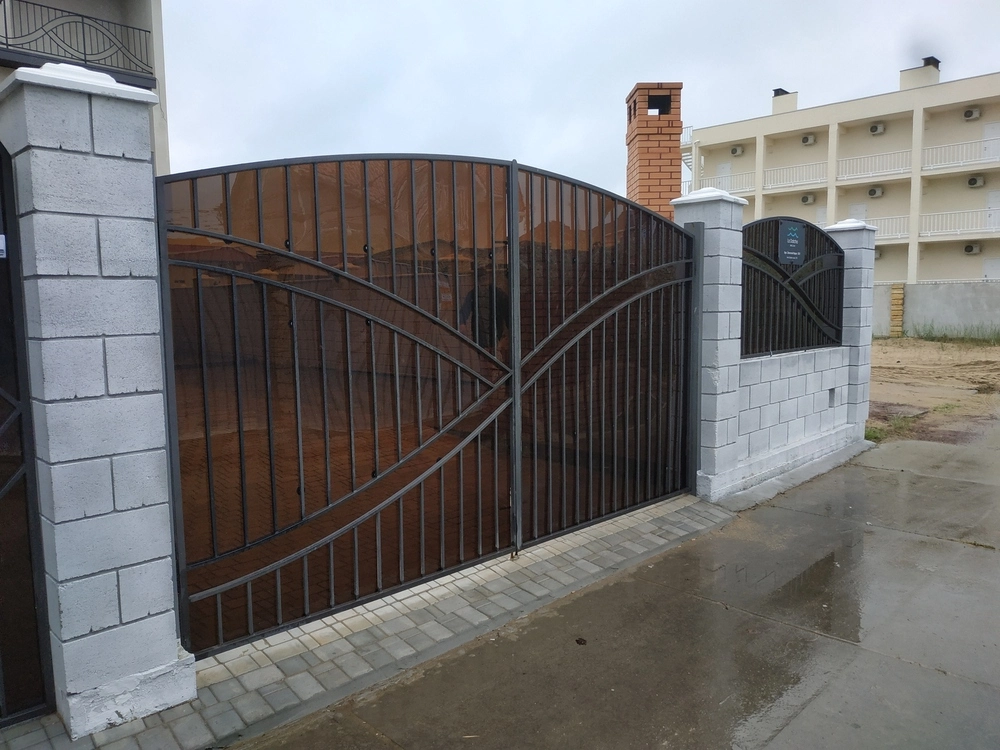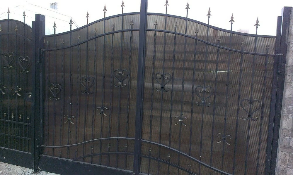Ворота з полікарбонату мають свої переваги. Зазвичай, такі ворота виготовляють як оздоблення кованих воріт - полікарбонат дозволяє приховати ваше подвір'я від сторонніх очей. Окрім того, полікарбонат має безліч переваг: